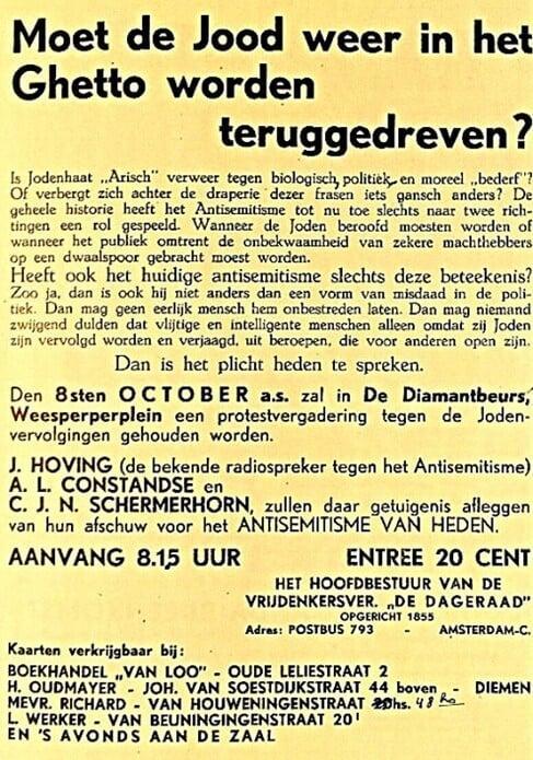 In de jaren 1930 kwam De Dageraad (voorloper van De Vrije Gedachte) in het geweer tegen de toenmalige vorm van Jodenhaat. Zo vond er op 8 oktober 1935 een door De Dageraad georganiseerde bijeenkomst plaats in de Diamantbeurs in Amsterdam. Sprekers waren o.a. Dageraad-kopstukken Jan Hoving en Anton Constandse. Op de aankondiging van de bijeenkomst in 1935 lezen we: Is Jodenhaat “Arisch” verweer tegen biologisch, politiek en moreel “bederf”? Of verbergt zich achter de draperie dezer frasen iets gansch anders?